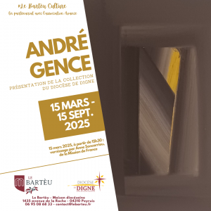 Présentation des œuvres d’André GENCE issues de la Collection du Diocèse de Digne. L’exposition sera visible du 15 mars au 15 septembre 2025 au Bartèu. Le vernissage est prévu samedi 15 mars, à partir de 15h30, en présence de Mgr Emmanuel Gobilliard.